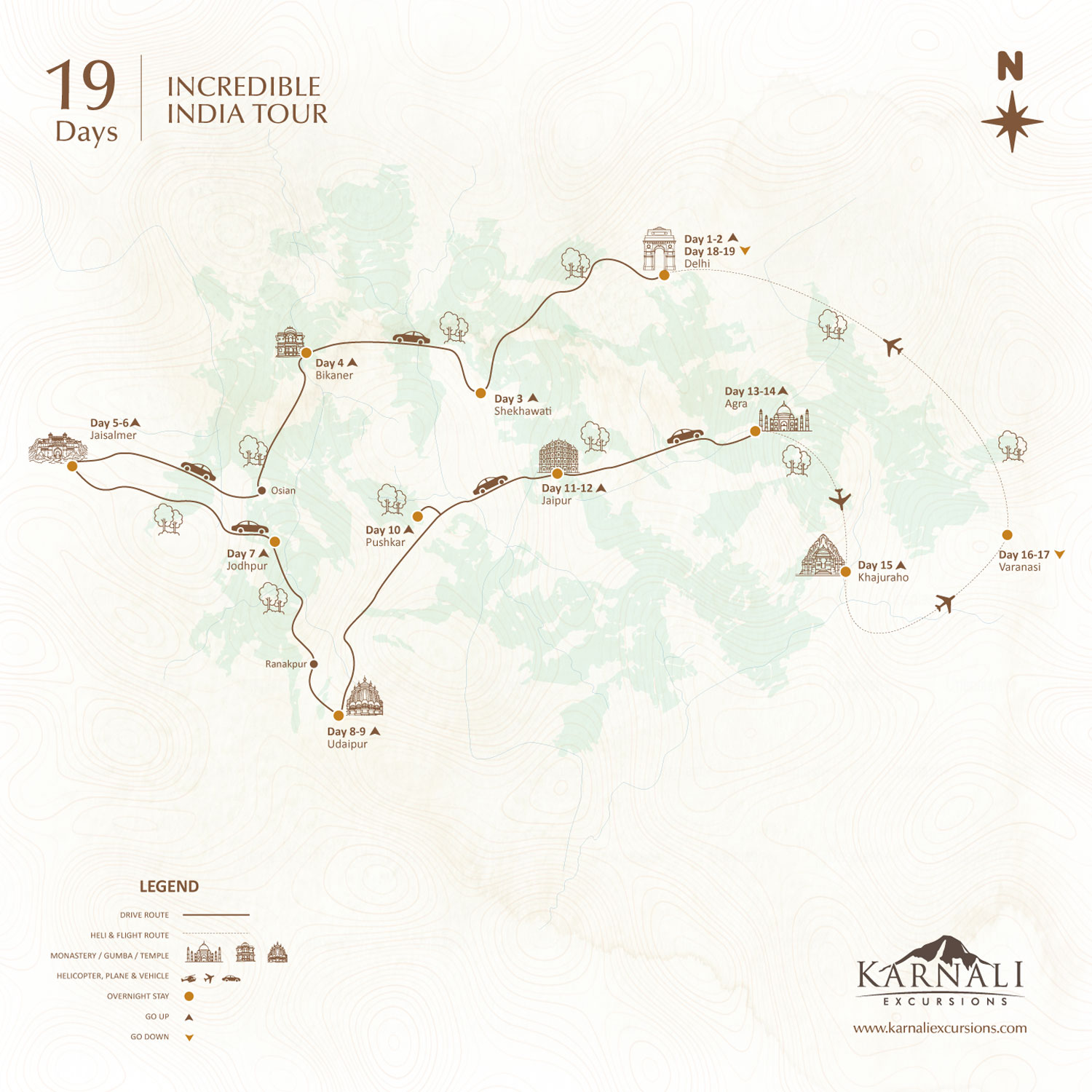 - Incredible India Tour: Delhi, Rajasthan (Jaipur, Udaipur, Jaisalmer, Jodhpur, Bikaner, Pushkar), Agra, Fatehpur Sikri, Taj Mahal